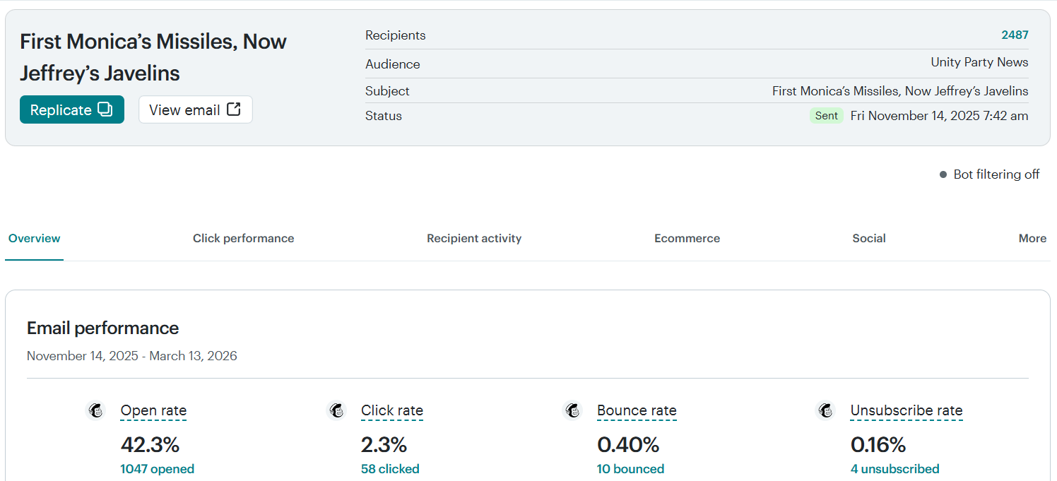 “No matter where they are in the world, whether they be in places like Venezuela or on the edge of the Sahara, the Unity Party of America will continue to seek out future American voters. No one for a moment should interpret this as any form of jingoism, but rather helping to steer the world towards a brighter and more peaceful future, a future whose darkness isn’t illuminated by missiles launched out of a need for a distraction from a Presidential scandal eerily reminiscent of Wag the Dog. First Monica’s Missiles, and now Jeffrey’s Javelins. Forward UP.”
